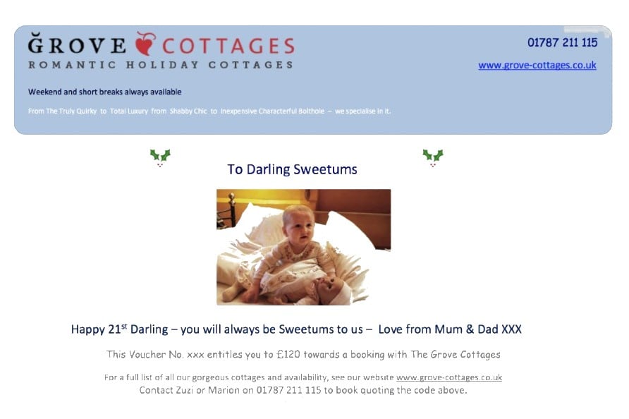 Your voucher can be emailed or posted on A5 card, below is an example of how it can look. Please call us on 01787 211115 to order or to discuss.